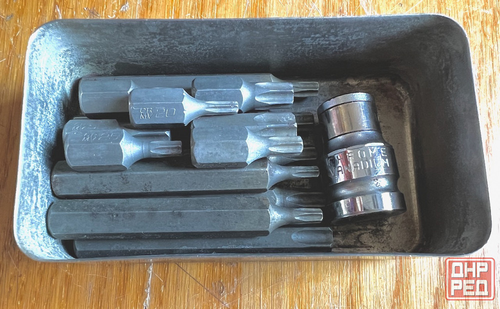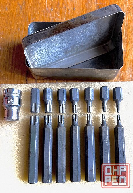 набор бит торкс звёздочки состоит из семи номеров т-20,25,30,40,45.50,55 бит длиной 30 мм , семи бит таких же номеров длиной 75 мм и битодержателя, в коробке из нержавейки. биты изготовлены из хромо-молибдено-ванадиевой стали, что делает их прочными, вязкими, термо и износостойкими.