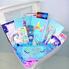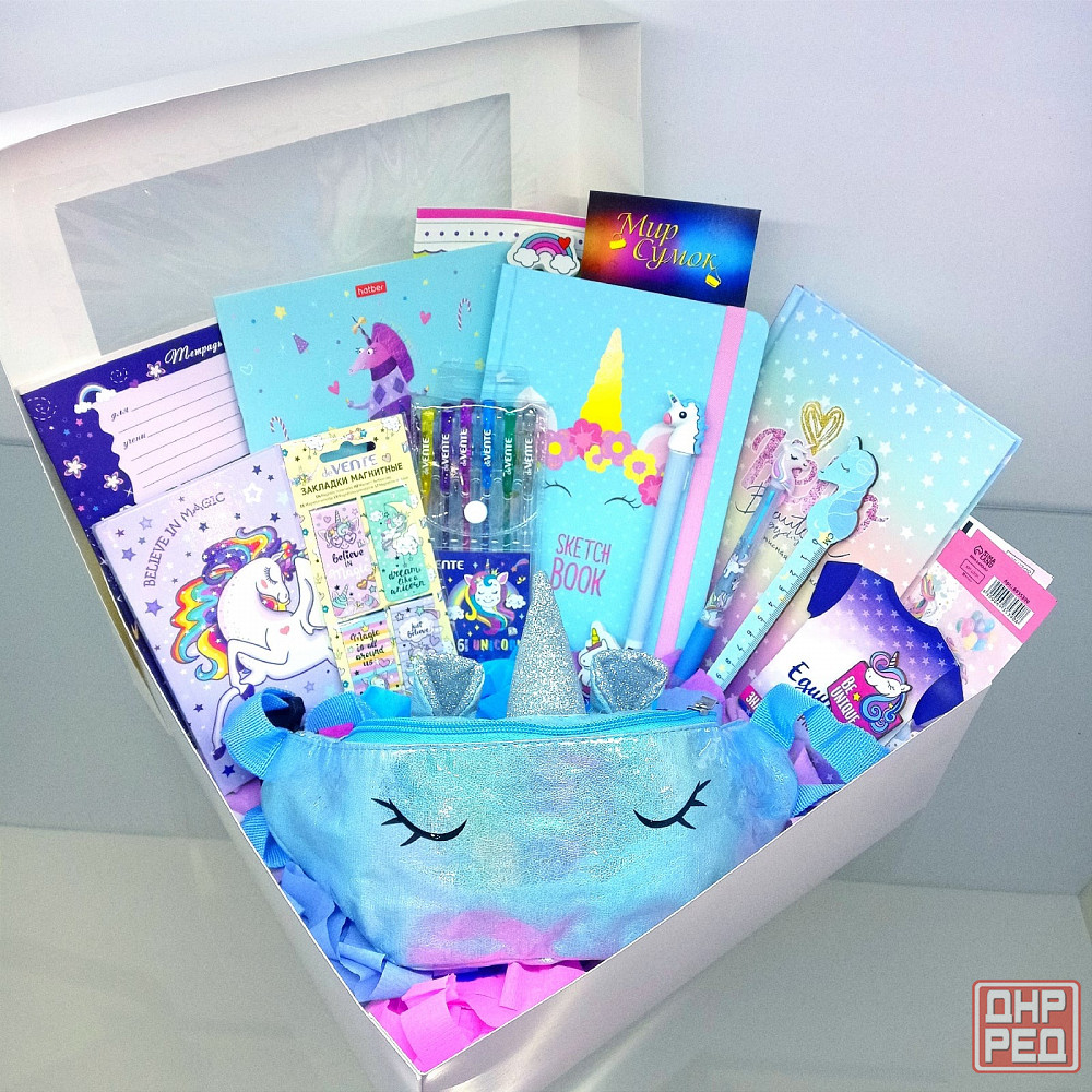 описание: подарочный набор: скетчбук а5 80л., без линовки, набор магнитных закладок, записная книжка а5 80 л., в клетку, блокнот а6 64л., в клетку линейка деревянная 12 см, сумка на пояс бананка, набор ручек гелевых 6 цв, ручка шариковая синяя светящиеся, ручка трёхцветная, наклейки 2 шт, тетрадь 12 л., в клетку, тетрадь 24 л., в линию, тетрадь 12 л., в линию ластики, значок.
