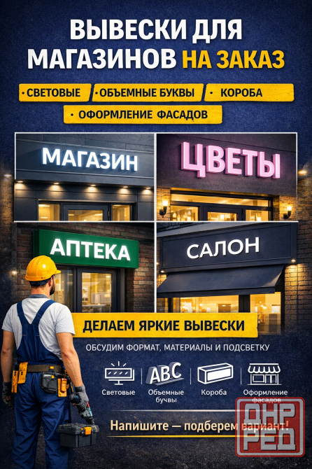 "медиас" - вывески для магазинов, световая вывеска, объемные буквы, короб с подсветкой, рекламная вывеска. заказать вывеску в донецке можете по телефону или пишите, отвечаем оперативно.
