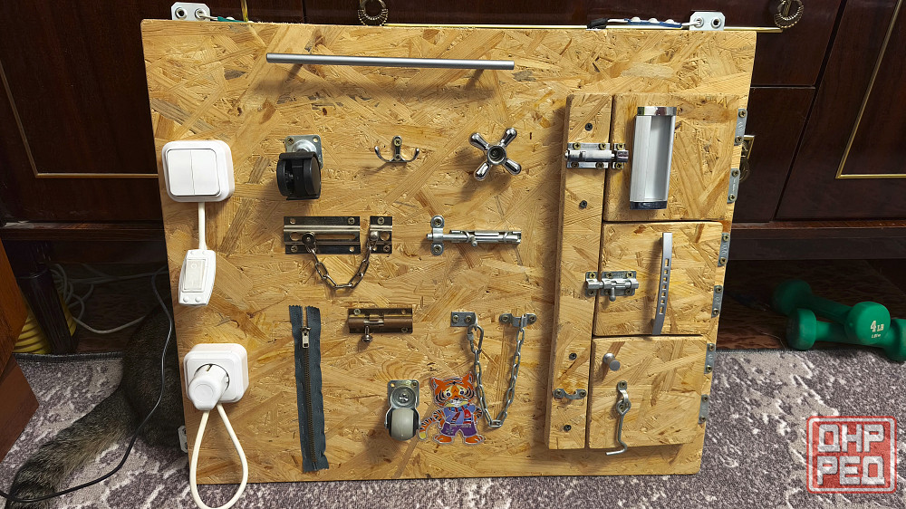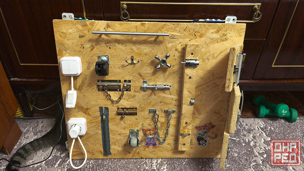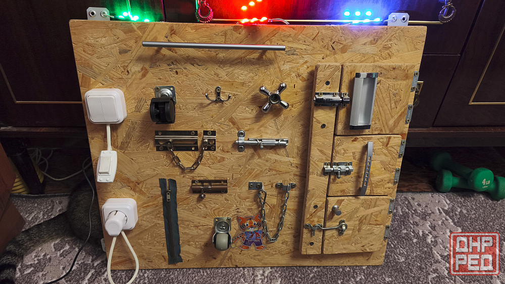 бизиборд с подсветкой. сделана электрика: подключается блок питания 12в, от него запитаны блоки светодиодов - зеленый, красный, синий через отдельные выключатели на бизиборде.