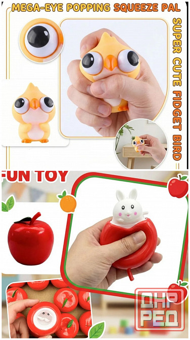 игрушки подойдут как детям, так и взрослым антистресс. при на жатии из яблока появляется заяц, а у цыпленка выпрыгивают глаза.