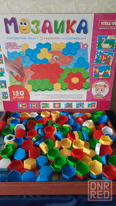 мозаика для детей от 1+ способствует развитию у детей мелкой моторики, воображения, усидчивости .безопасный пластик, крупные фишки , чтобы ребенок не мог их проглотить. набор состоит из прозрачного поля, 5 картинок -иллюстраций для помощи сборки и 150 штук шестигранных фишек. набор упакован в самодельную фанерную коробку родная бумажная порвалась быстро размером 41см*51см*5см. самовывоз.