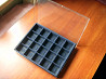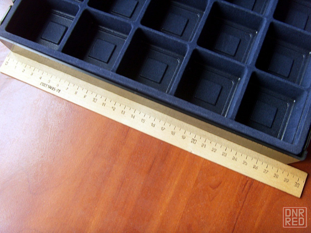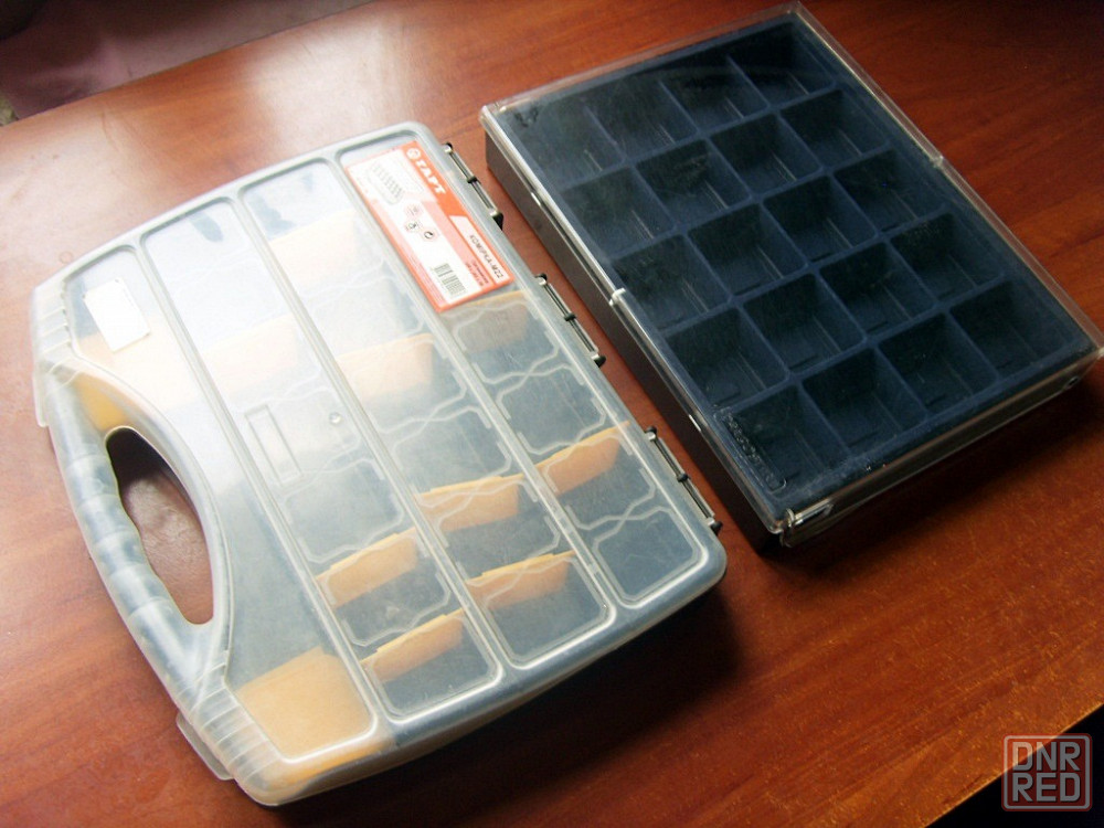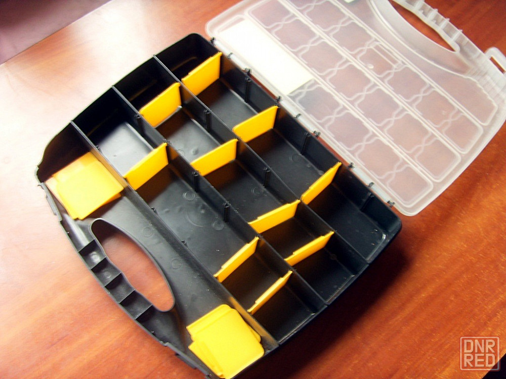 один типа кейса с ручкой и со вставными жёлтыми перегородками, которые можно комбинировать по-разному и делать ячейки разного размера или вообще их убрать.