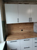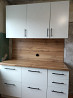 кухонная мебель практически новая, белого цвета. верхние шкафы имеют современные кронштейны и вывешиваются на специальные пластины, прикреплённые к стене. это обеспечивает несложный монтаж на высоте. шкафы плотно прилегают друг к другу. шкафы снабжены полочками. нижняя часть кухни состоит из тумбочек, накрытых «дебелой» столешницей современной расцветки. тумбочки снабжены ящиками, очень легко двигающимися, благодаря современным устройствам на шариках. фартук кухни из очень плотного двп, такого же цвета, как и столешница. общая длина кухни 1,5 м. самовывоз.