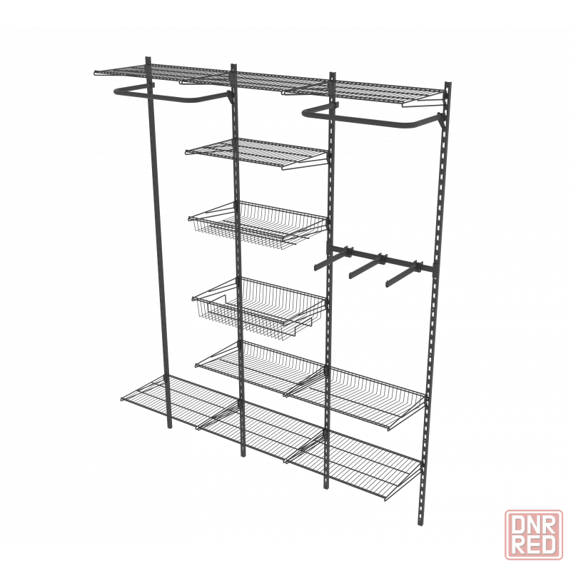 сборный комплект для гардеробной — удобное и функциональное решение для организации хранения одежды, обуви и аксессуаров в доме или офисе. продуманная система вертикальных стоек, сетчатых полок, выдвижных корзин и штанг под вешалки позволяет рационально использовать пространство от пола до потолка и легко менять конфигурацию под любые потребности.