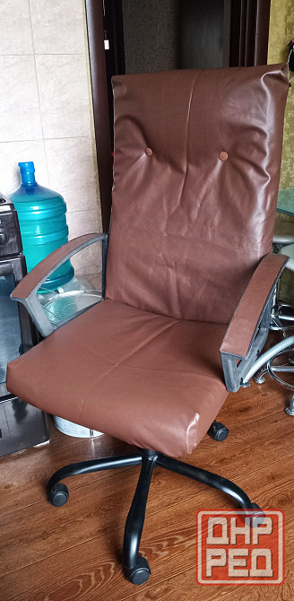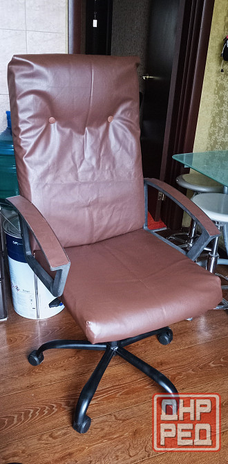 кресло крупное, компъютерное, заводской кожзам потрескался, перетянуто новым прочным.этот выдержит не один год газлифт и механизм качания исправны. стальная прочная крестовина.