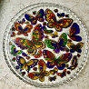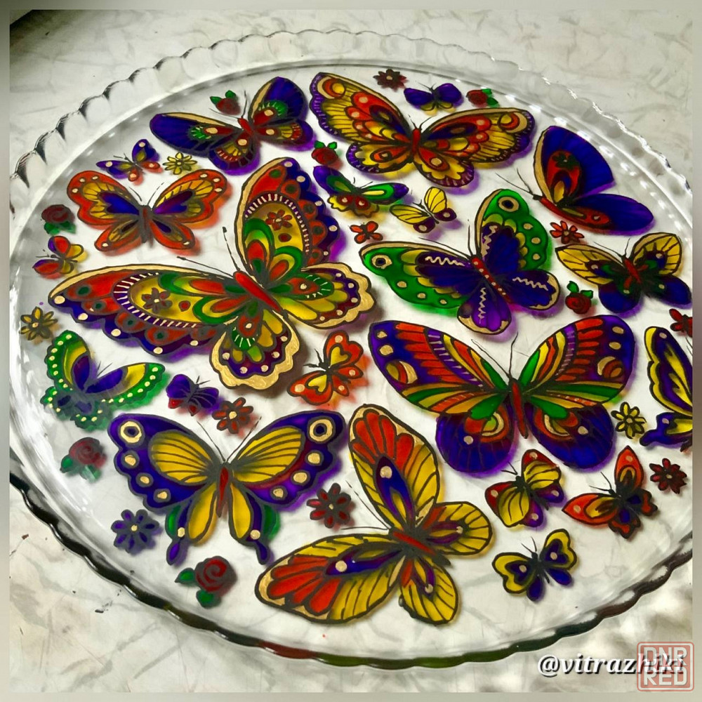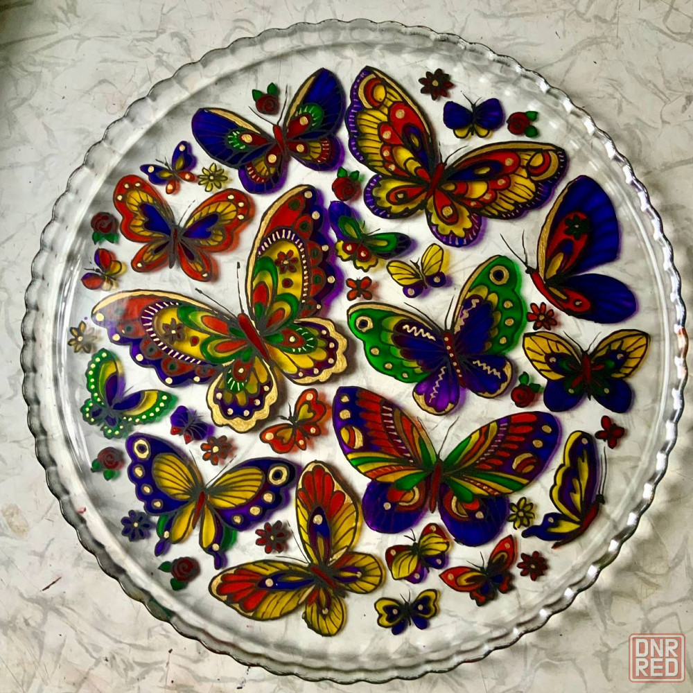 витражная роспись по стеклу. роспись нанесена с нижней стороны блюда, поэтому продукты на блюде не касаются росписи. прекрасно смотрится на светлой скатерти идеально - на белой. подходит для торта, кекса, фруктов, сладостей, блинчиков.