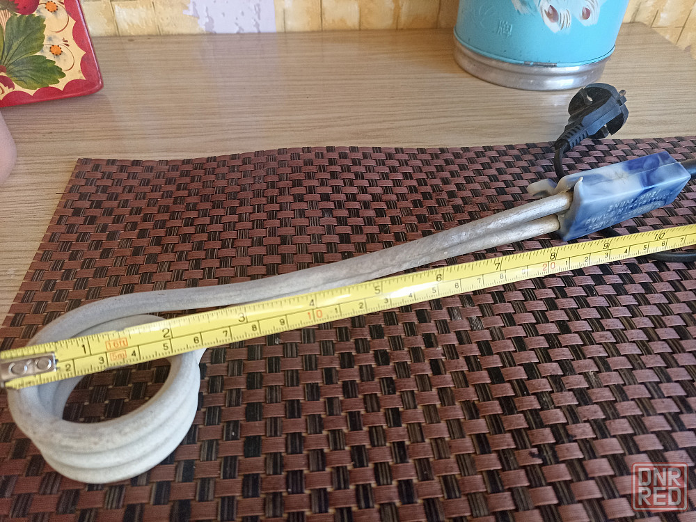 большой электрокипятильник. можно быстро нагреть воду в ведре или другой большой ёмкости. общая длина 30 см, без пластмассовой части -- 24 см.