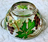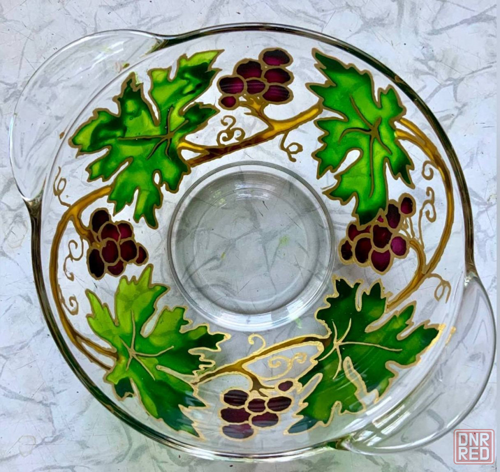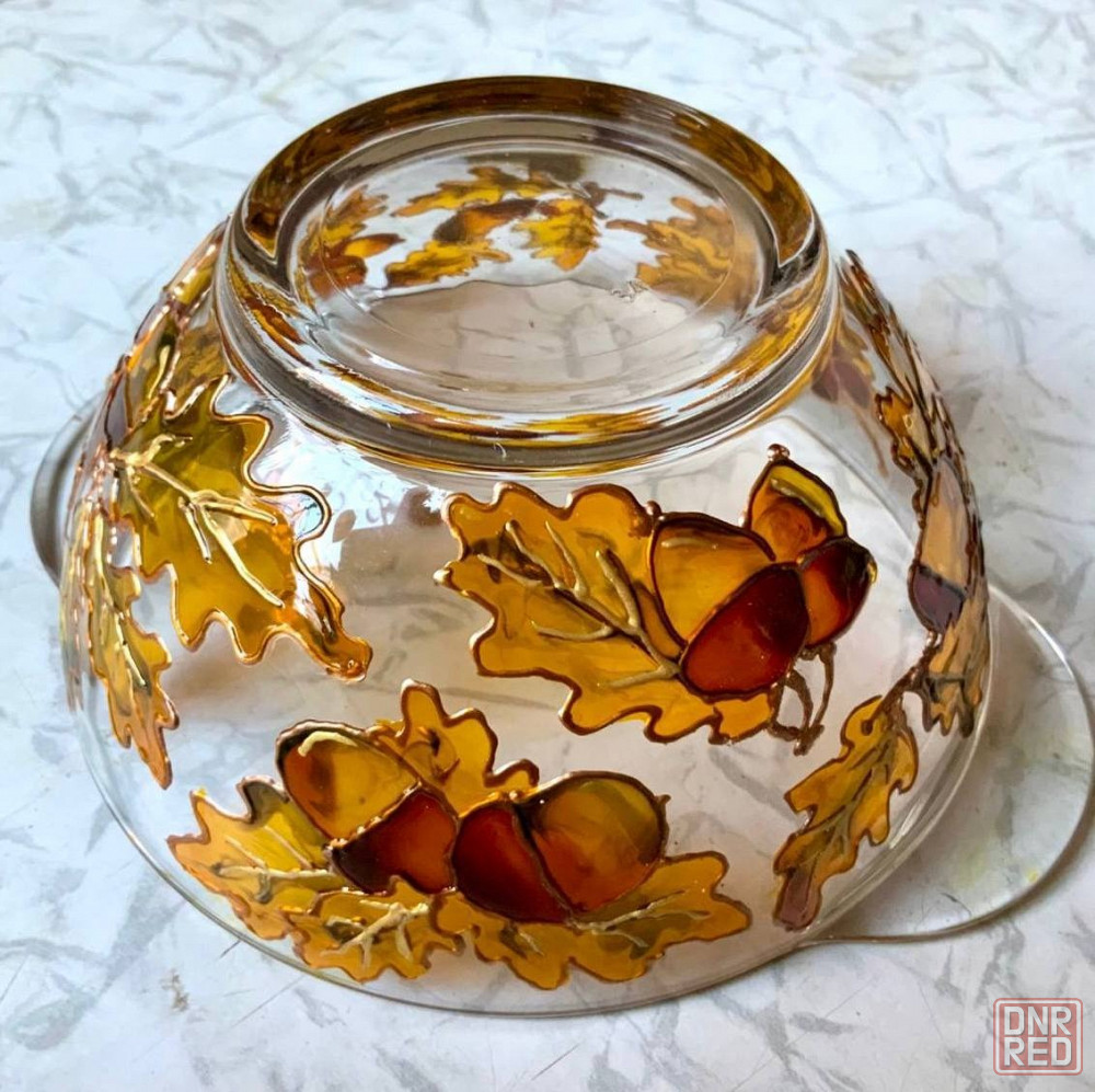 витражная роспись по стеклу. роспись нанесена с внешней стороны супниц, поэтому продукты в ней не касаются росписи.
