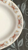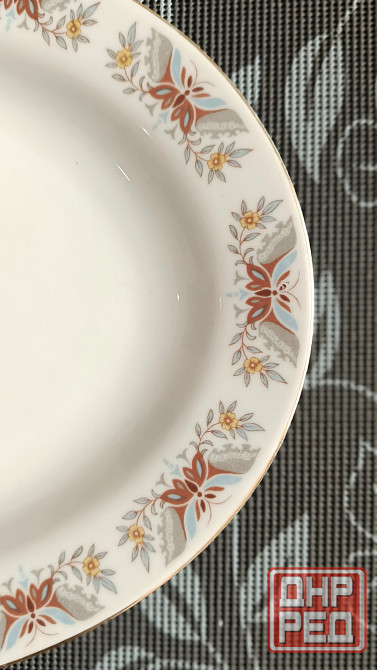 декорировано каймой с цветочным орнаментом в красных, серых и желтых тонах. по краю блюда проходит тонкая золотистая окантовка.