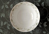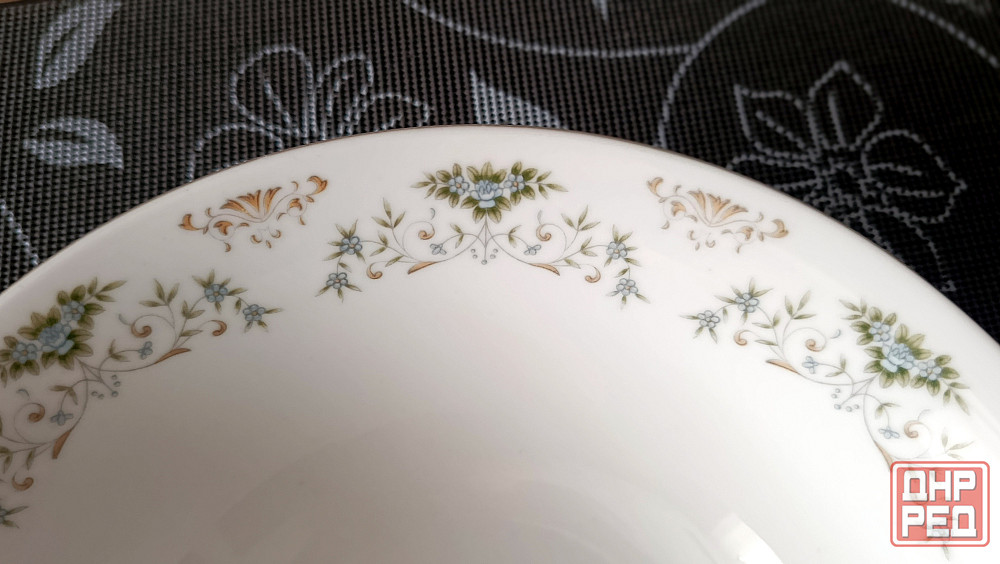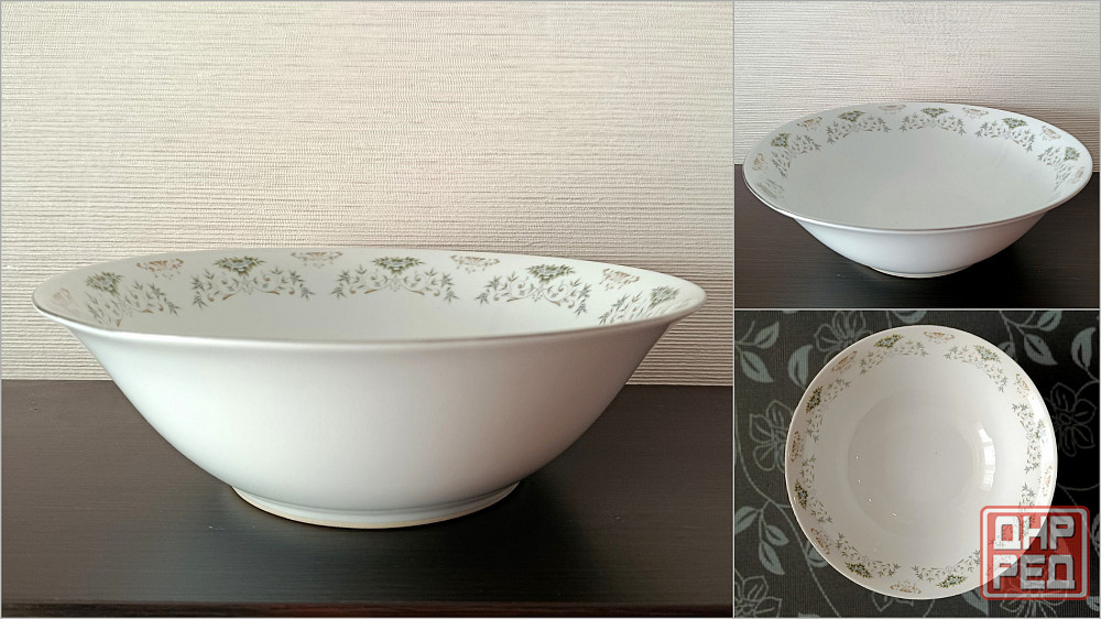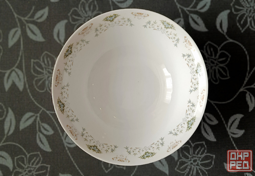 добротный фарфор с нежным цветочным узором. по краю блюда проходит тонкая золотистая окантовка.