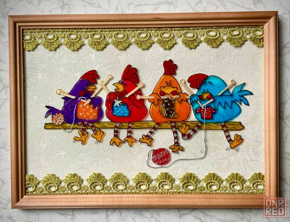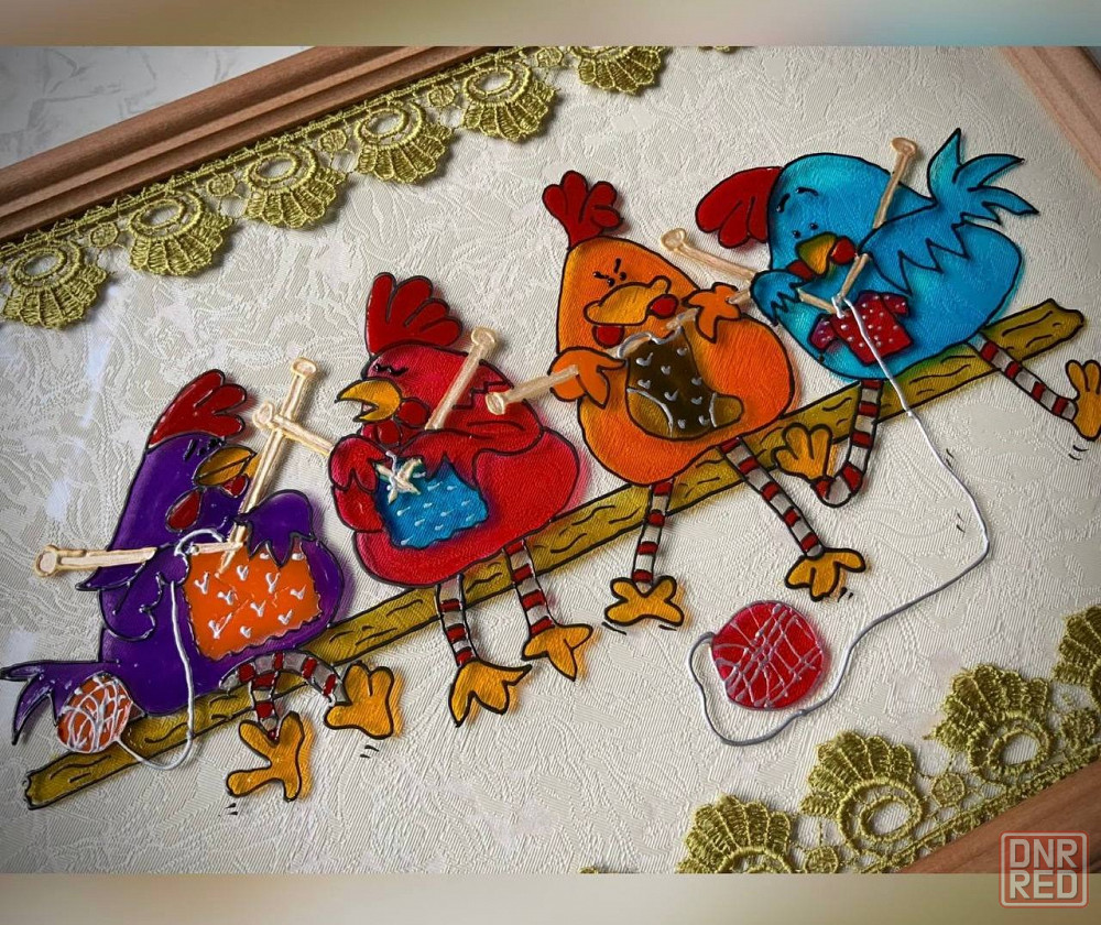 витражная роспись по стеклу французскими красками фирмы lefranc&burgeous. сверху и снизу оформлена кружевной тесьмой.