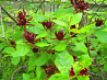 достаточно крупные необычной формы цветки 4-7 см, с темно-красными, бордовыми, пурпурно-коричневого цвета обильно появляются в начале цветения, а потом периодически в течение лета.