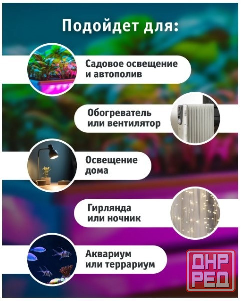 - универсальность: подходит для управления светом, обогревателями, насосами, гирляндами и другими устройствами.