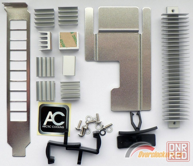 в комплекте сама система охлаждения с болтиками 4шт, клипсы пластиковые 2шт и радиаторы для чипов видеопамяти 8шт.