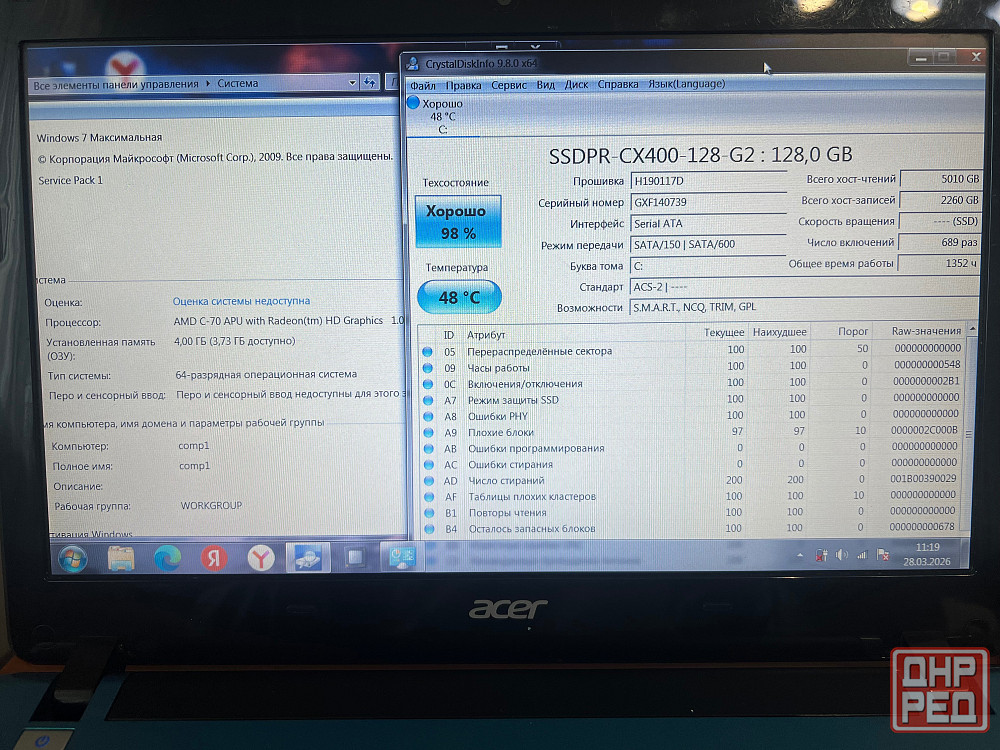 11.6" acer aspire one 725,amd- c 70, 4 gb, 128 gb, ssd, radeon hd7290 ₽ 4 500