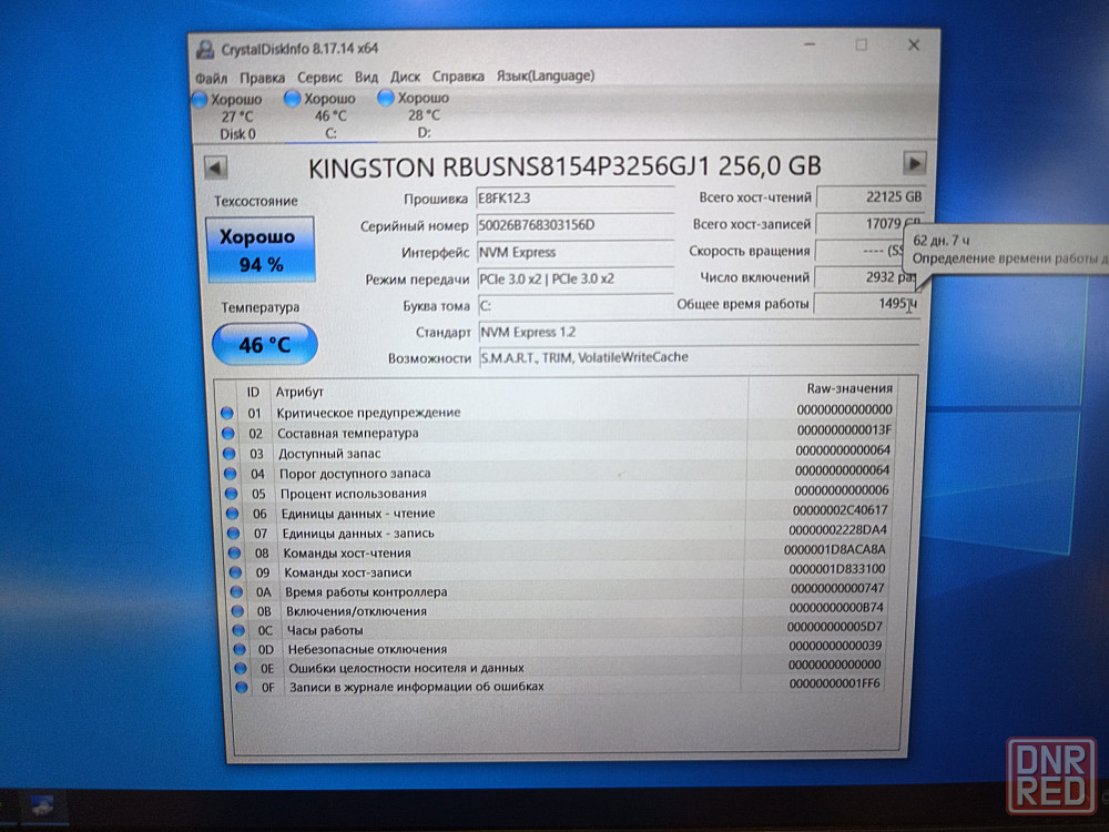 *накопитель: ssd типа m2 nwme kingston-256 гб всего 62 дня наработки