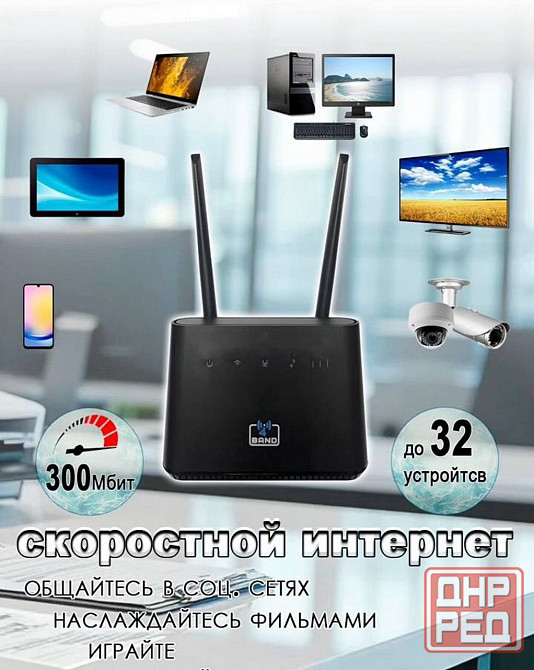• роутер раздает wifi на частоте 2.4мгц на площадь до 100м2 и до 32x устройств одновременно;