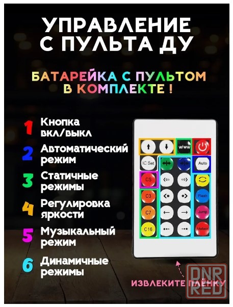 при помощи удобного пульта можно выбирать различные эффекты: бегущий, плавный, стробоскоп, мерцание, поочередные мигания, включать и выключать свет, а также, менять яркость ну и конечно выбрать цвет по своему настроению