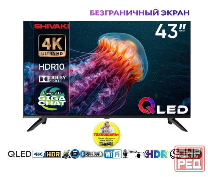 телевизор shivaki s43qs qled 4k с диагональю 43 дюйма от известного японского бренда подарит вам потрясающее качество изображения в формате 4k uhd3840х2160 пикс. благодаря технологии qled и контрастности 5000:1, вы сможете наслаждаться яркими, насыщенными цветами и глубоким черным цветом. в совокупности с оптимально подобранными значениями яркости, контрастности и высокой частотой обновления оно позволяет смотреть современное кино без компромиссов по качеству картинки, играть в новые видеоигры без подвисаний и следить за ходом динамичных спортивных матчей. встроенная операционная система салют тв с поддержкой голосового управления и возможностью управления со смартфона обеспечит удобный и интуитивно понятный интерфейс. установите часто используемые приложения в телевизор на базе ос android и используйте их точно также, как на вашем смартфоне. shivaki s43qs оборудован тюнером т2, позволяющим ему принимать программы эфирного цифрового тв в высоком качестве, а, также, кабельным и спутниковым тюнером. телевизор оснащен тремя портами hdmi, двумя портами usb и оптическим выходом, что позволяет подключить к нему различные устройства, такие как игровые консоли, blu-ray-плееры и soundbar. модель s43qs также поддерживает wi-fi стандарта 2t2r 2.4g&5g hz и bluetooth, что позволяет легко подключиться к домашней сети и беспроводным устройствам. с помощью функции miracast вы сможете транслировать контент с вашего смартфона или планшета на большой экран. звуковая система мощностью 20 вт в конфигурации 2.0 с поддержкой dolby digital обеспечивает объёмное звучание без внешних колонок.
