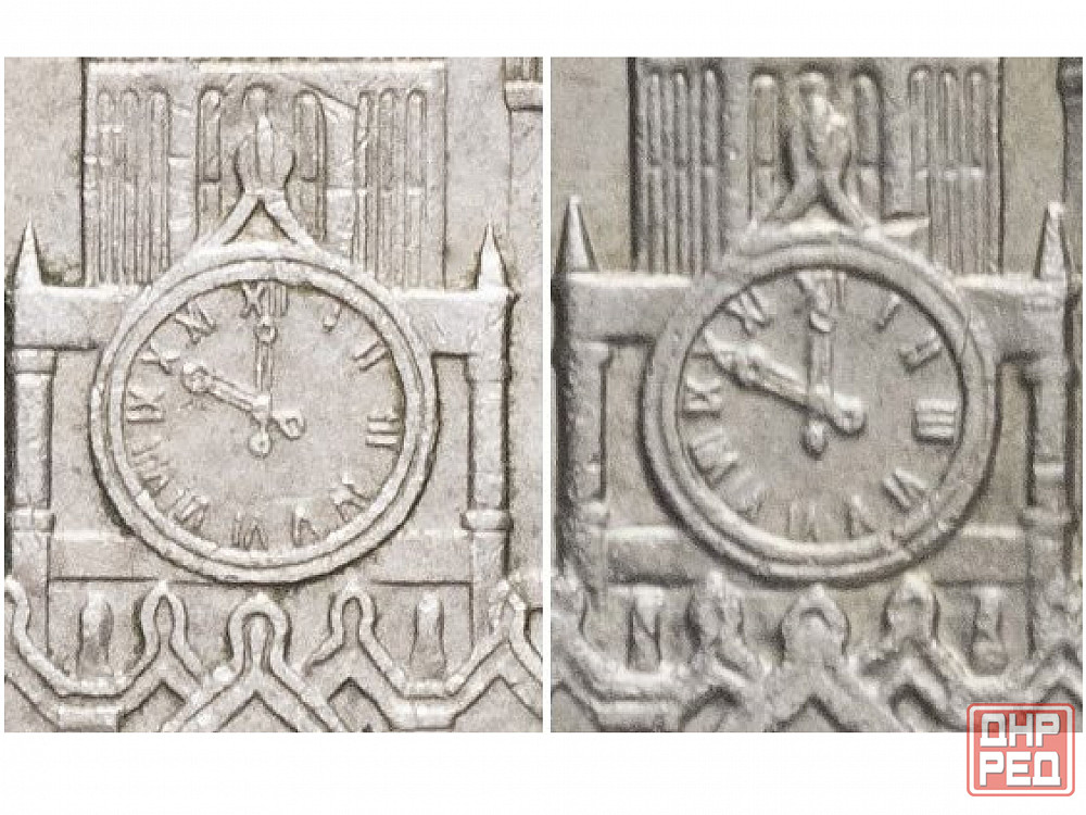на другой монете ошибка: на циферблате часов вместо цифры «iv» и «vii» ошибочно отчеканена цифра «vi» - 100руб.