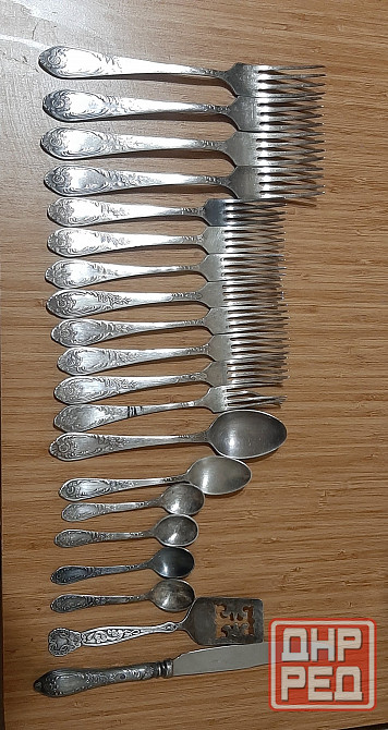 вилки большие 4 шт,десертные 8шт,ложки десерта 1шт,чайная 1шт, чайные маленькие 4 шт,лопатка для торта 1шт,нож 1шт.