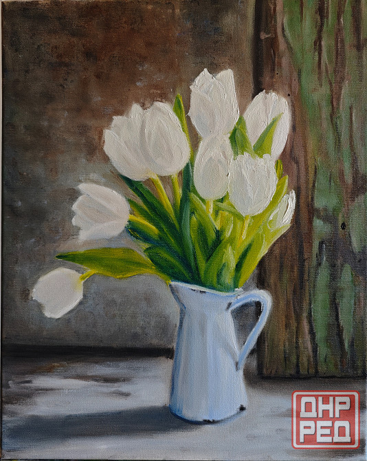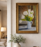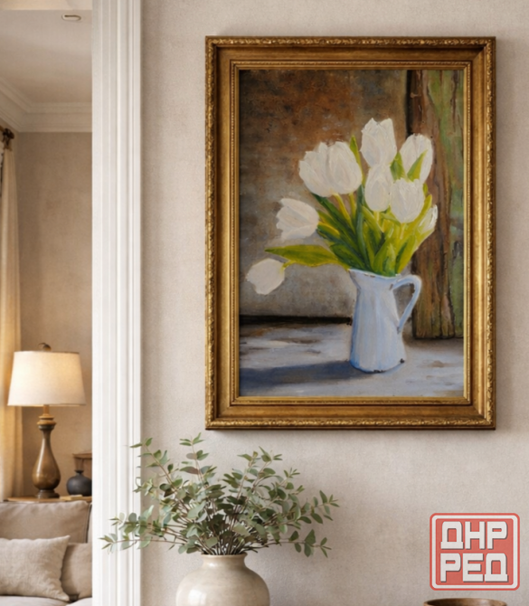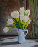 спокойный интерьерный натюрморт с белыми тюльпанами в кувшине. мягкая цветовая гамма, естественный свет, подходит для кухни, спальни или светлой гостиной.