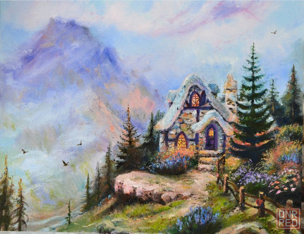 таинственный лес, горы и сказочно-красивый коттедж , встречающий вас своим теплым светом из окон. люблю картины кинкейда за наполненность добротой и позитивом.
