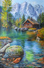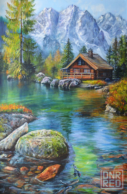 живопись. красивая уютная интерьерная картина. деревянный домик на берегу реки у подножия гор.