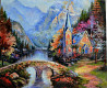 таинственный лес, горы, горная река, арочный каменный мост, увитый плетущимися розами. люблю картины кинкейда за наполненность добротой и позитивом.