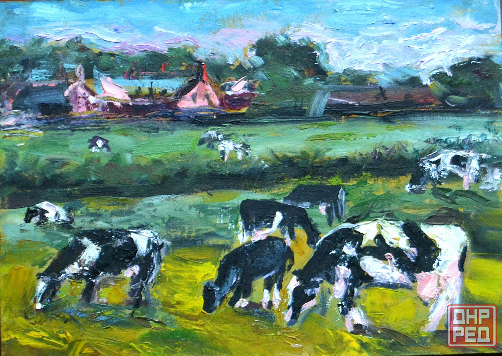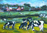 на полотне изображены пятнистые коровы в солнечный летний день пасутся на зеленом лугу высоко в горах, вдали фермерские домики. работа выполнена в зеленой цветовой гамме с фактурными выпуклыми мазками.