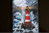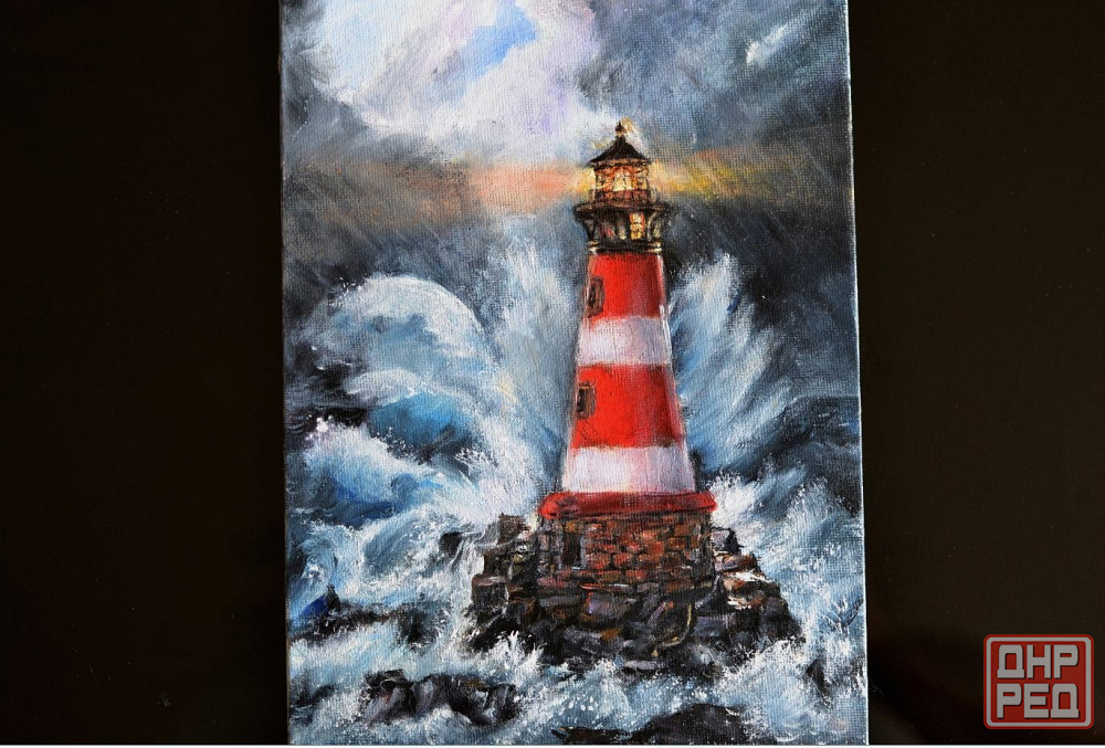 на полотне изображена морская стихия, волны, разбивающиеся о скалу с маяком. работа выполнена широкими живописными мазками, свет маяка ночью, создающего взрыв эмоций и ностальгию.