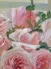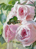 на полотне розовые розы в белом кувшине. картина выполнена в теплой пастельной цветовой гамме с мягкими живописными мазками и детализированным фоном, создающим атмосферу уюта, ностальгии и спокойствия.
