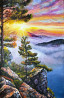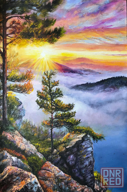 продается картина маслом на холсте "рассвет на вершине мира". яркая картина - оригинальное украшение современного интерьера. красивый восход солнца придает особый колорит картине, наполняет ее могучей энергией. первые лучи солнышка скользят по верхушкам елей, по скале, окрашивая ее в оттенки золота и багрянца. внизу синеет океан, окутанный на горизонте густыми белыми облаками.