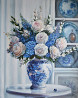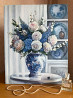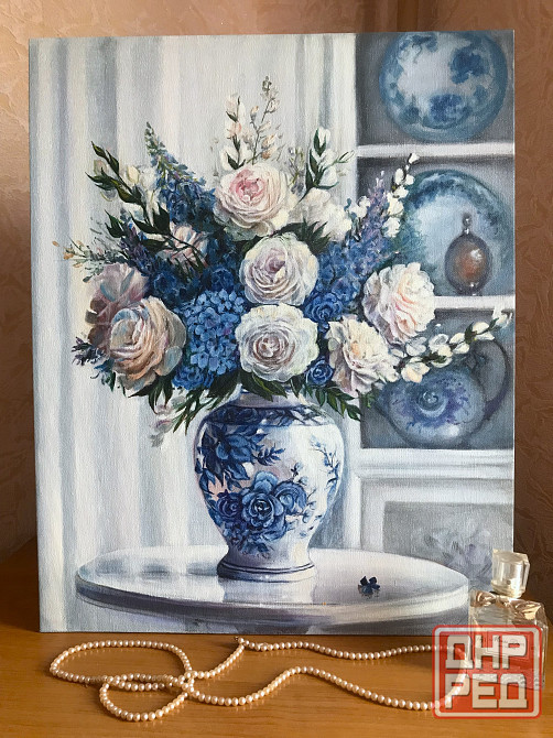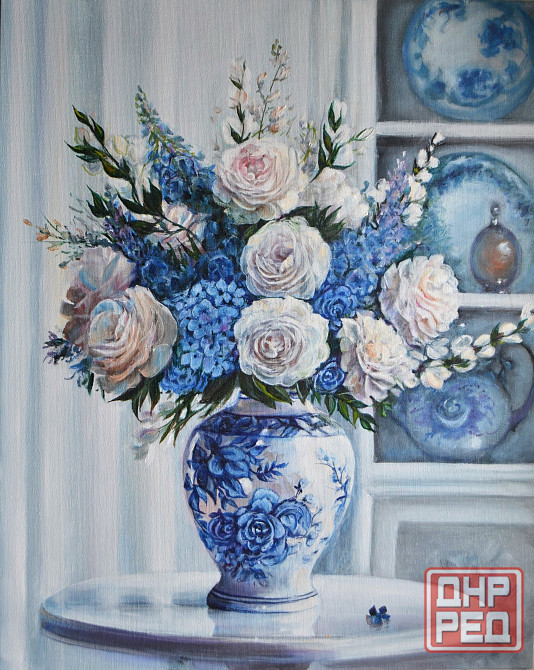 представляем масляную картину на холсте ручной работы "розы в китайской вазе". на полотне изображен натюрморт с цветами в вазе розовые чайные розы, гортензии, синие дельфиниумы. работа выполнена в бело-голубой нежной цветовой гамме с мягкими живописными мазками и детализированным фоном, создающим уюта, ностальгии и волшебства. создайте свою неповторимую атмосферу в доме .