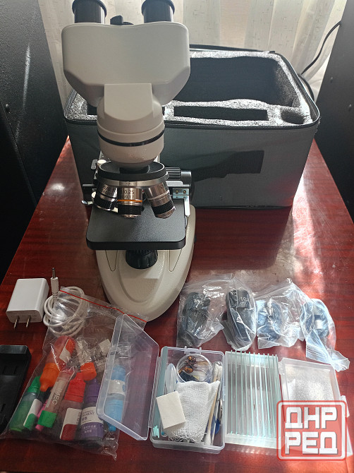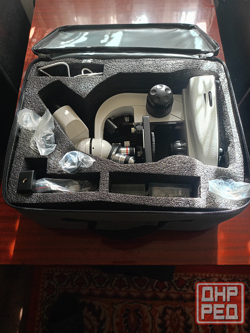 микроскоп комплектный, две подсветки нижняя и верхняя, 4 окуляра, 4 обектива, грубая и точная настройка , материал для наблюдения и др.
