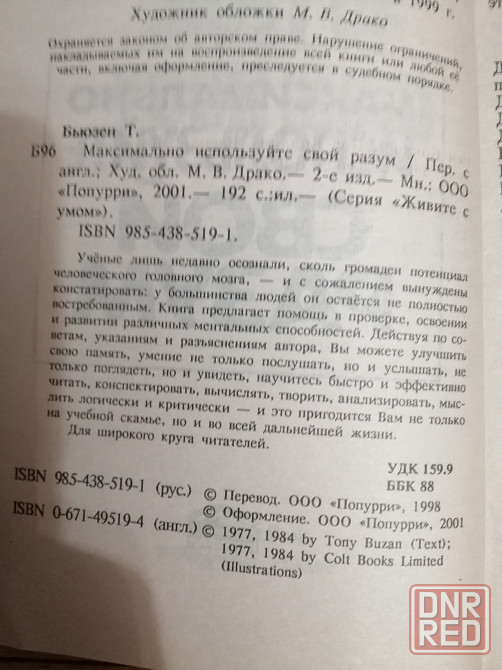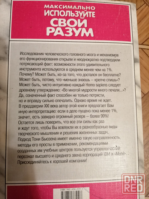 продам книгу. тони бьюзен "максимально используйте свой разум". состояние отличное. рекомендации как улучшить память, научиться слушать, быстро вычислять и многие другие полезные советы. смотрите все мои объявления. звоните. фен 5299745. есть телеграм.