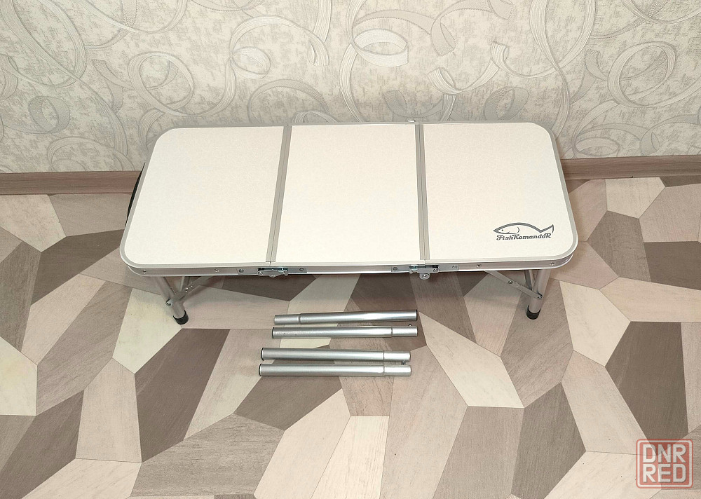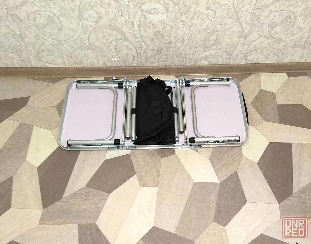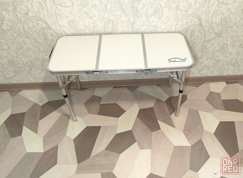 столешница складывается на три части, благодаря чему стол занимает минимум места, что очень важно при транспортировке. стол имеет ручку для переноски.