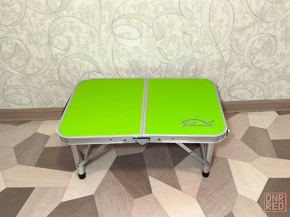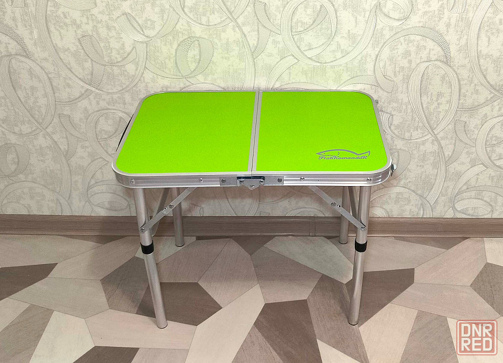 столешница стола складывается пополам. для удобства транспортировки имеется ручка для переноски.