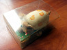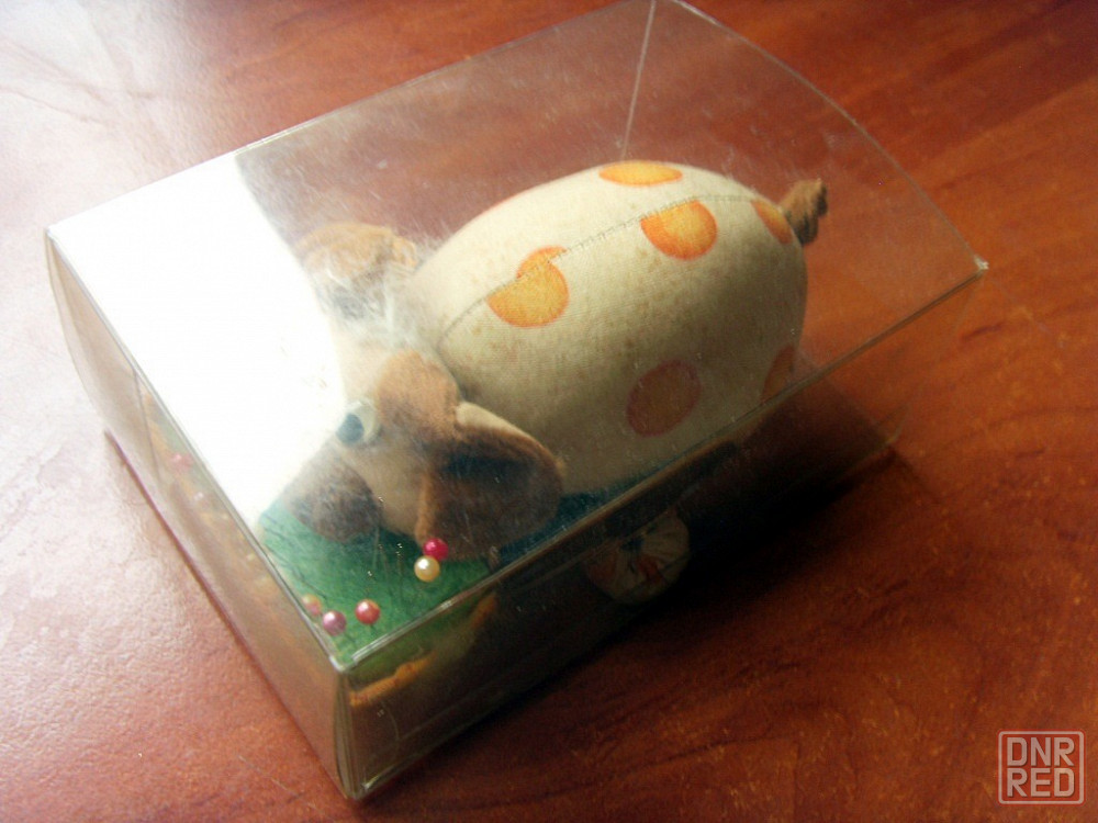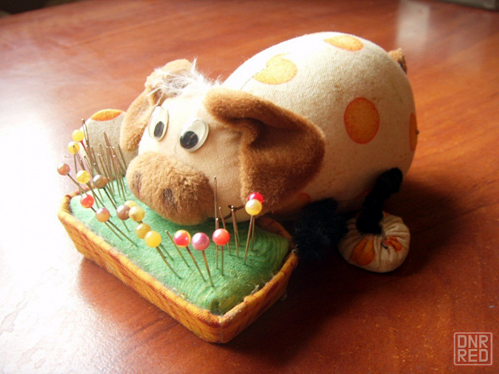 подушечка в виде коровки с иголками и булавками. есть прозрачная пластиковая коробочка для неё.
