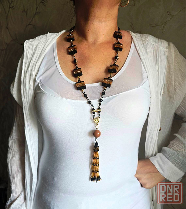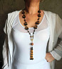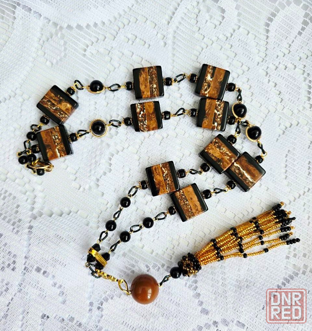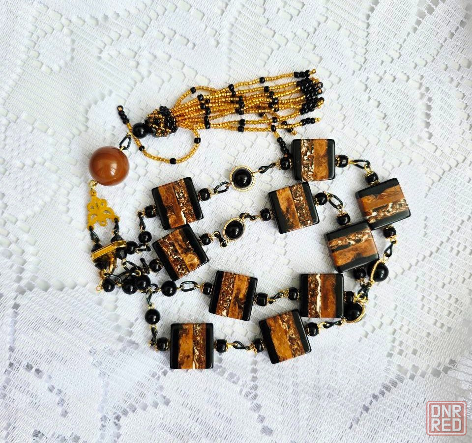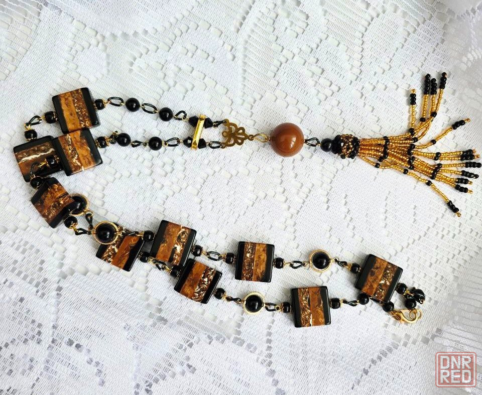 нарядный сотуар из крупных бусин и бисера с кистью., соединенные цепочкой. длина сотуара 90 см + 11 см кисть.