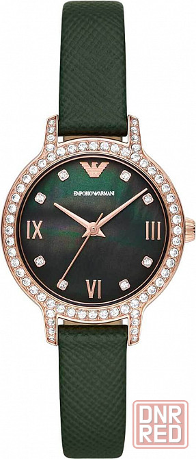 женские наручные часы. круглый стальной корпус инкрустирован кристаллами. перламутровый циферблат защищен минеральнымминеральное стеклостекло, получаемое в процессе обработки минеральных пород. для использования в часах проходит специальную закалку для придания большей твёрдости и устойчивости к царапинам. уступает по этим качествам сапфировому стеклу. стеклом. метки в виде точек с кристаллами и римских цифр. рифленая заводная головка. кожаный ремешок с классической застежкой.