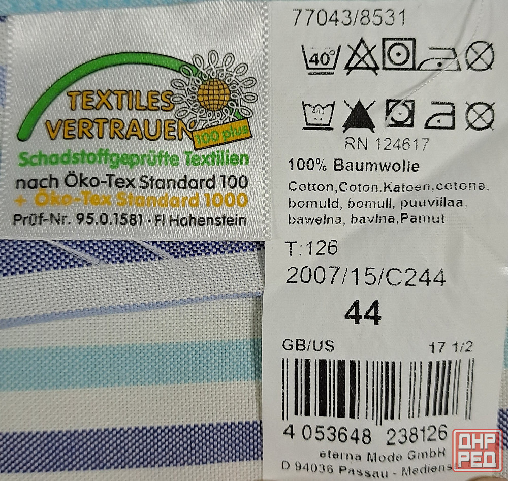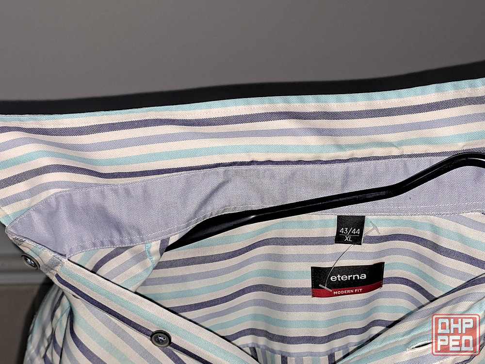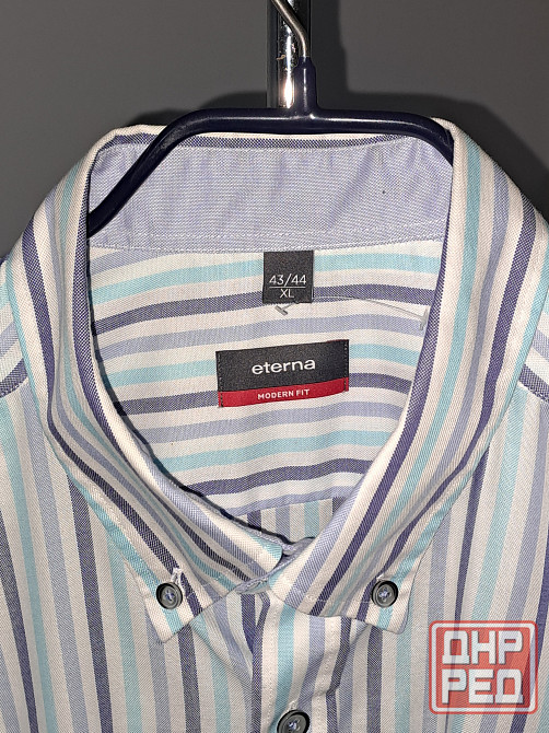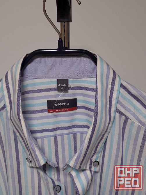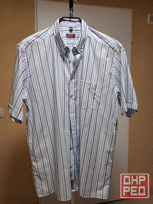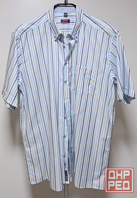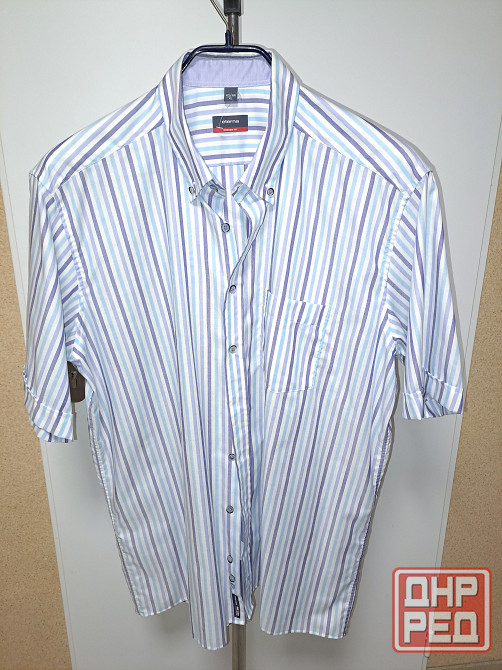 рубашка новая без бирки мужская с коротким рукавом, размер 43-44 xl. бренд eterna, цвет белый в голубую и синюю полоску. 100% хлопок, производство германия. рубашку не надевали, но бирка не сохранилась. крой рубашки прямой, ширина 61 см, длина 81 см, длина рукава 29 см, ширина между плечевыми швами в застегнутом виде 50 см, длина окружности ворота в застегнутом виде 42-43 см.