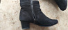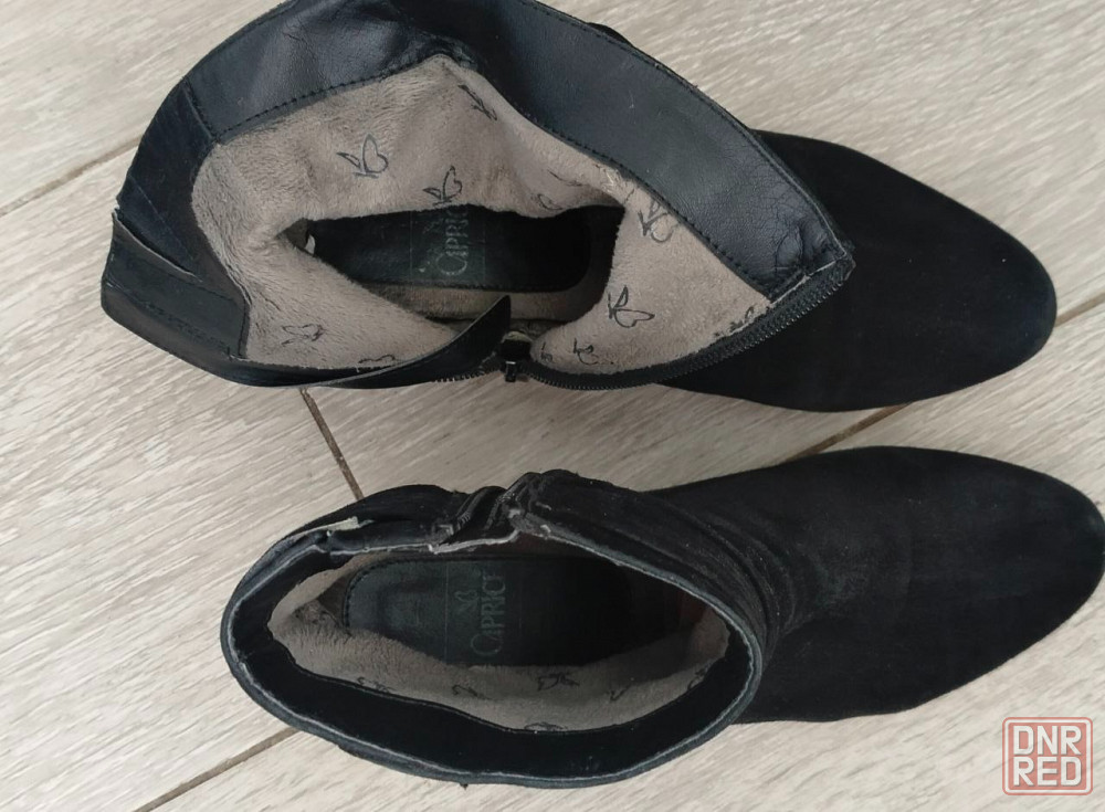 полусапожки черные из натуральной замши, 38 размер, полнота средняя. состояние хорошее, набойки менялись. демисезонные, подкладка -байка. немецкая фирма caprice. колодка очень удобная, мягкие. в верхней части голенища резинка для регулировки ширины.