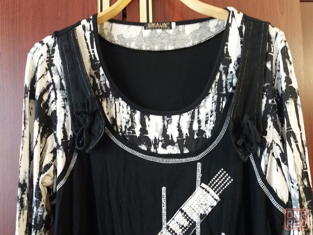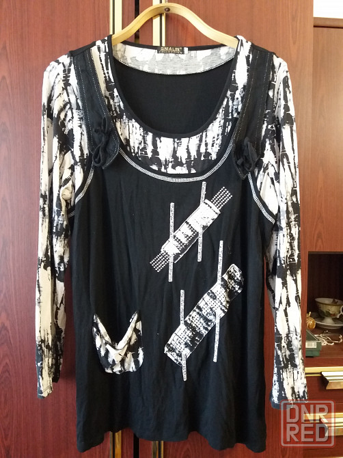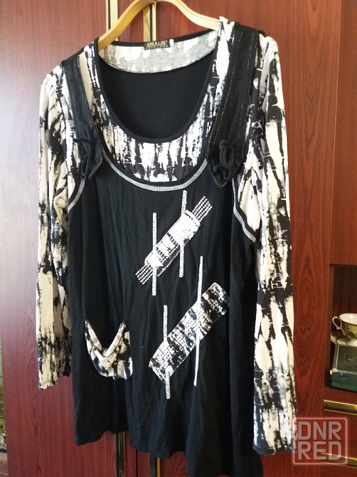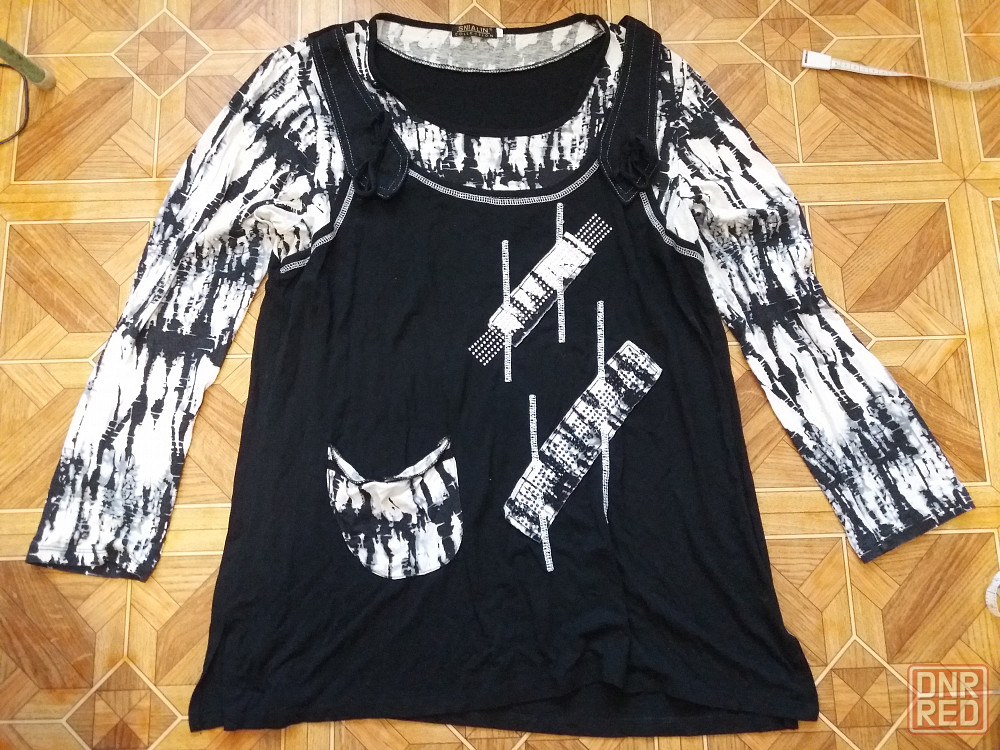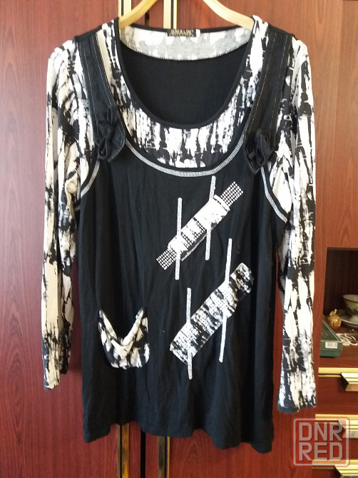 продам блузу блузон футболку. черно-белого цвета. состояние отличное. трикотаж вискоза. тянется в разумных пределах. размер написан 54. ширина по переду под мышками 54 см, плечи 43 см , длина по спинке от шейного шва 70 см, рукав 58 см. звоните. фен 529 9745.