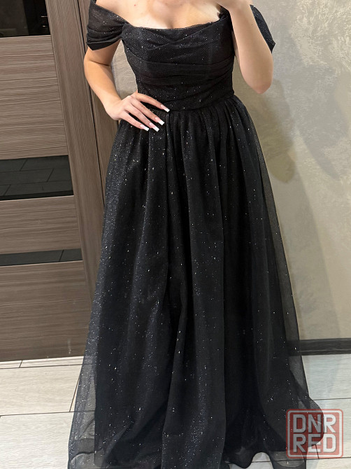 выпускное платье в пол из люрекса, черное. на ноге по длине юбки вырез, платье корсетное со спущенными рукавами, которые можно отстегнуть. сзади шнуровка. размер 44, одевалось один раз, было в химчистке и хранится в чехле. донецк. цена 17.000, возможен небольшой торгпокупалось в свадебном салоне за 30 тысяч