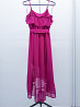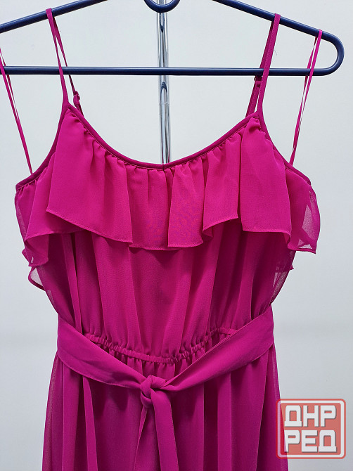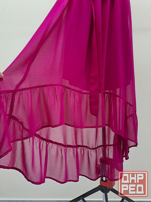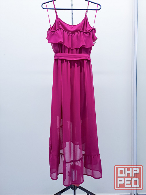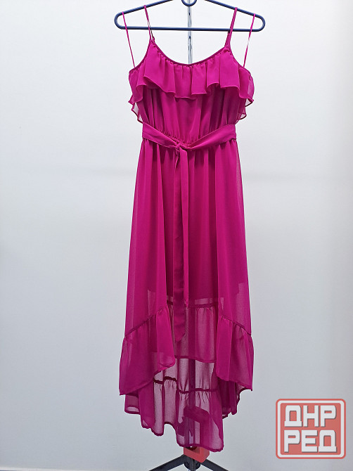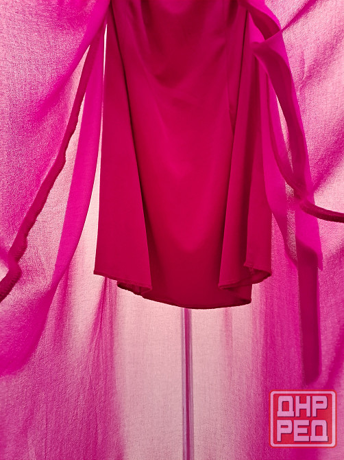 платье женское сарафан, цвет фуксия, размер 48 l. асимметричный крой - спереди короче, сзади длиннее, небольшой шлейф. бренд daniele patrici, производство китай. платье в отличном состоянии, нет дефектов и следов носки. юбка внизу красиво просвечивается. внутри вшито мягко обтягивающее непрозрачное мини платье. ширина платья в груди 45-46 см. в талии резинка растягивается от 38 до 50 см в ширину. длина юбки спереди от пояса 64 см, сзади от пояса 88 см. лента пояс из той же ткани прилагается. при покупке платья хенд-мейд серьги в подарок.