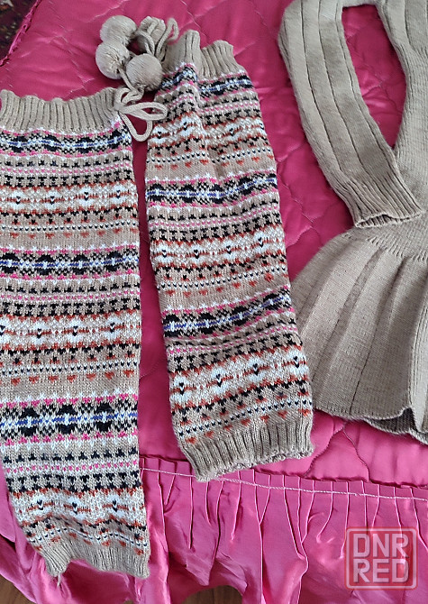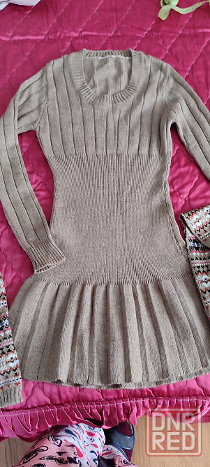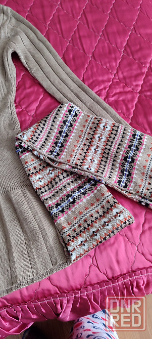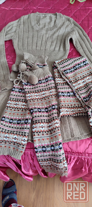 теплое турецкое платье, 50% шерсть 50% акрил. не кашлатится. очень мягкое и легкое. за счет вязки сядет на любую фигуру. платье состояния нового, один раз одето. на 44-46 размер. в комплекте идет шарф и гетры. длина по спинке 82 см.
