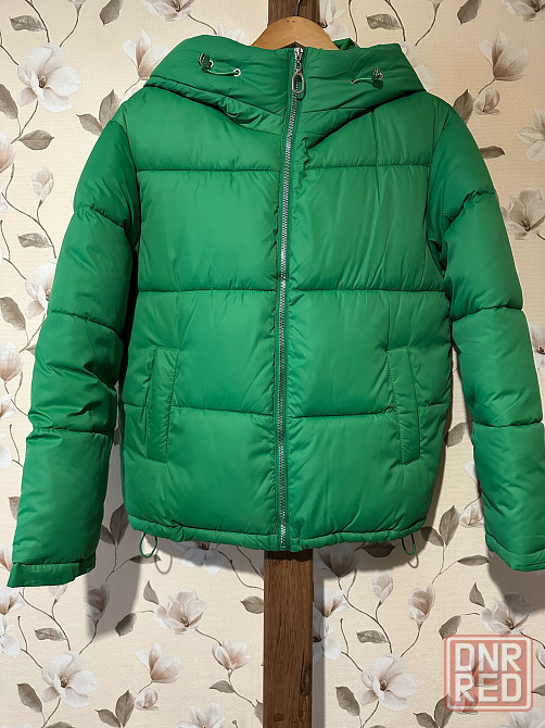 куртка на синтепоне с капюшоном, на теплую зиму/осень. 44 размер. состояние отличное, надевалась 2 раза. внизу на кулисках.