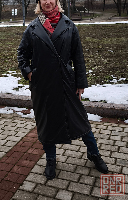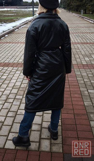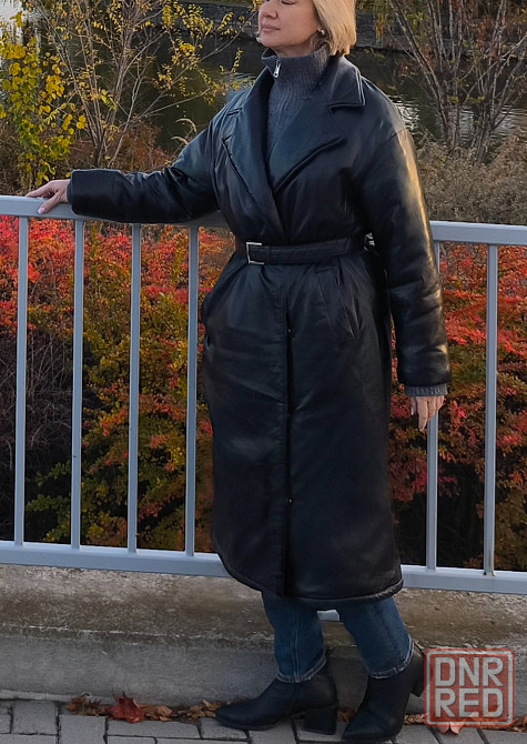 пальто кожаное на синтепоне с поясом в отличном состоянии. можно носить как с поясом так и без него. длина, примерно, 120 см.